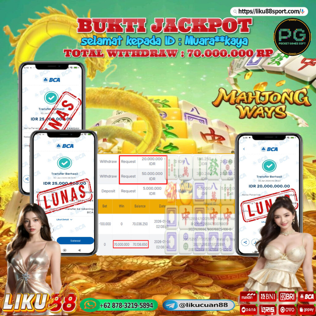 Semua dana kemenangan, termasuk jackpot besar, akan ditransfer hingga lunas tanpa biaya tambahan. Kami menjamin tidak ada pending yang tidak jelas di LIKU88.