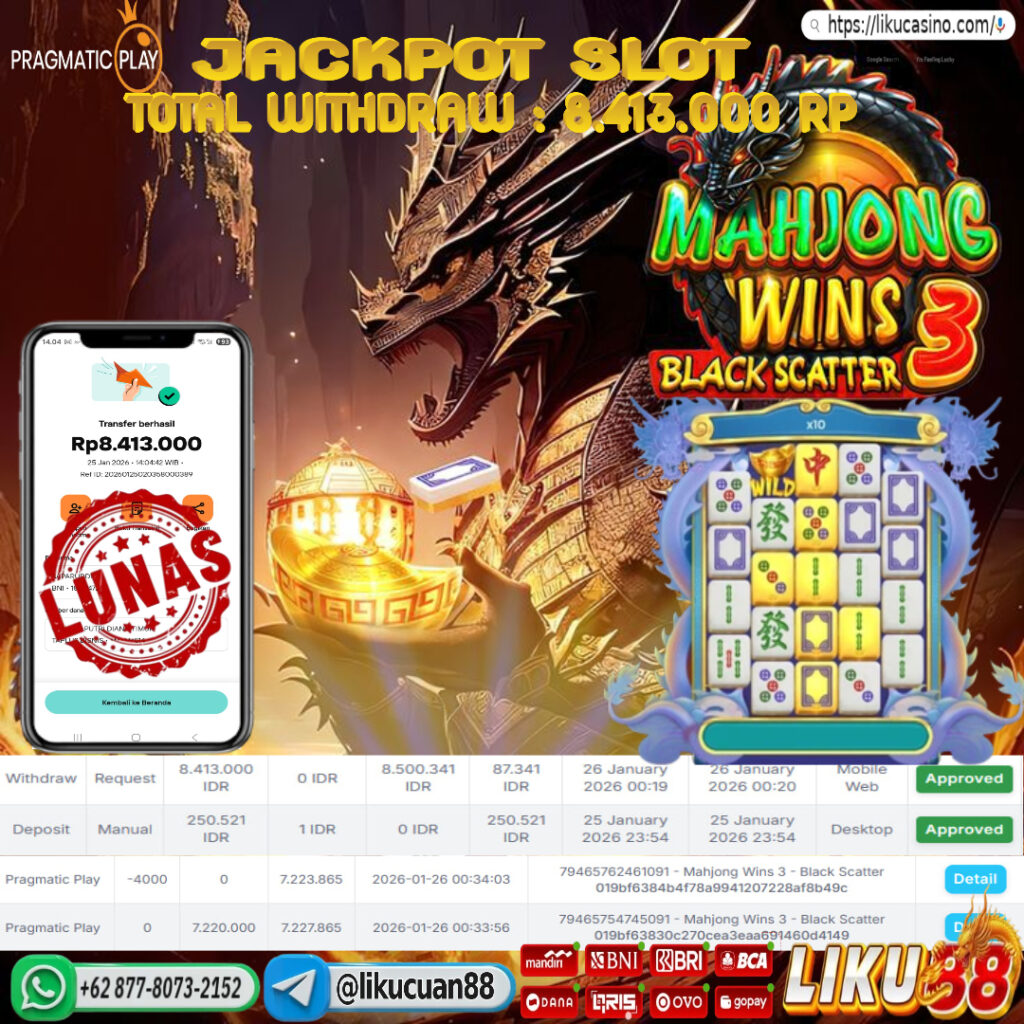 LIKU88 JACKPOT SLOT PRAGMATIC MAHJONG WINS 3 BLACK SCATTER Rp.8.413.000,- LUNAS
