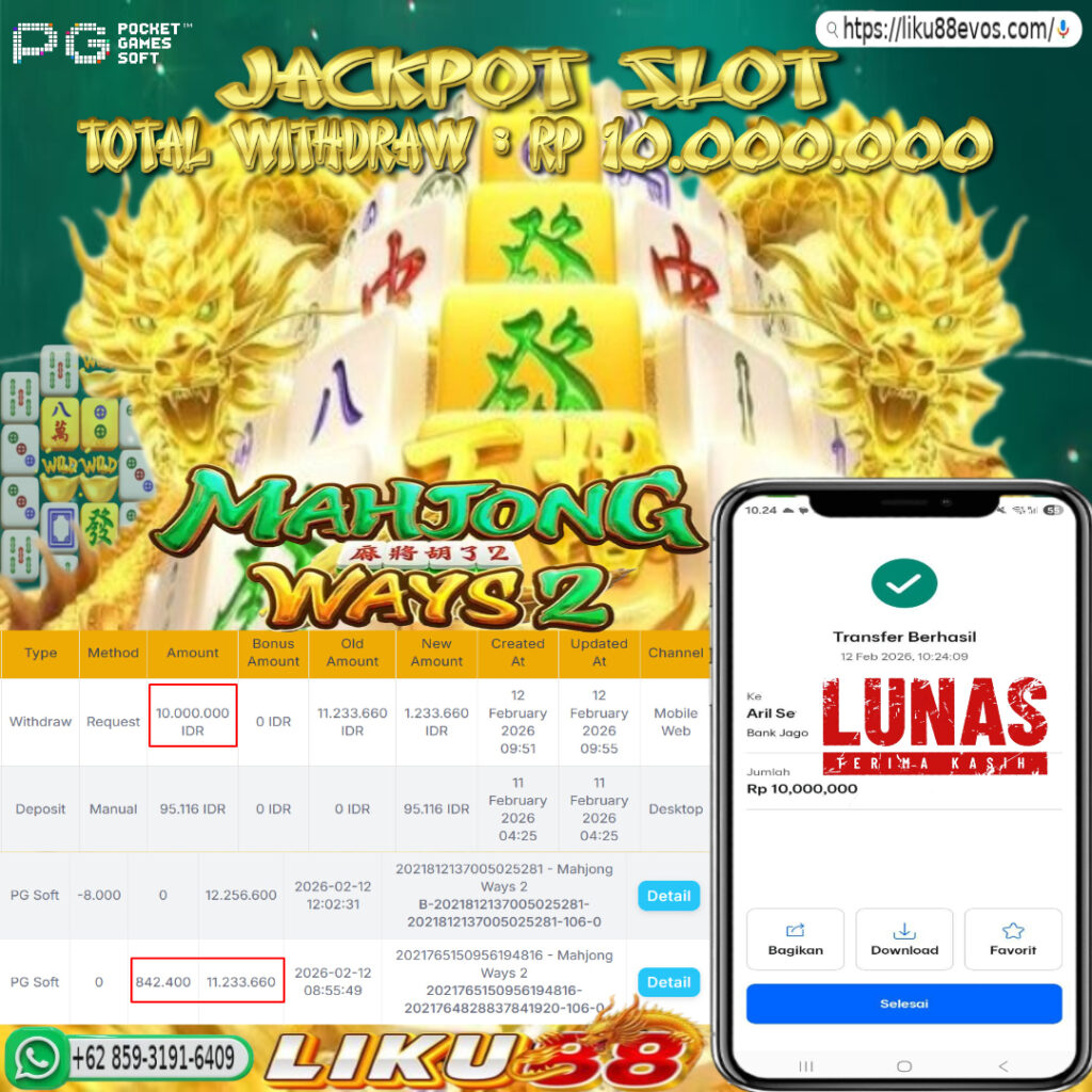 LIKU88 JACKPOT SLOT PG SOFT MAHJONG WAYS 2 Rp.10.000.000,- LUNAS.
